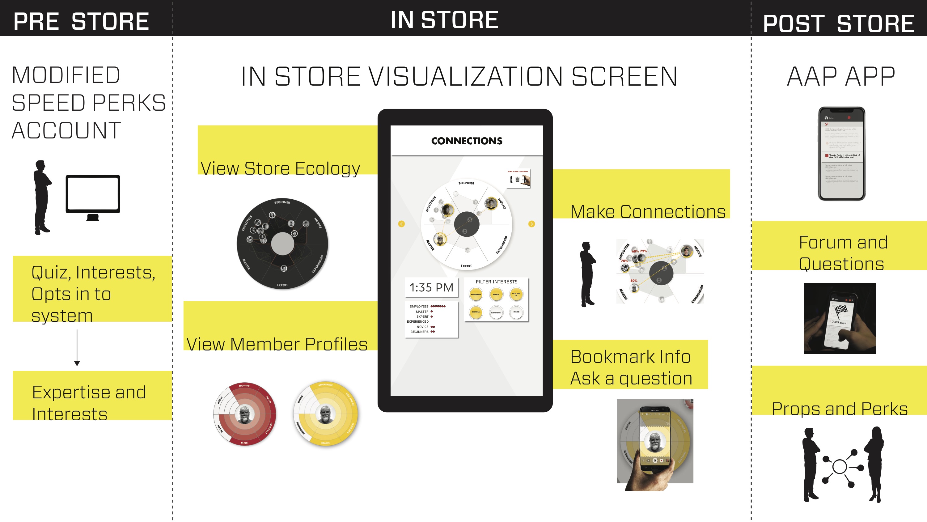 The final concept is centers around a revamping of the auto-store’s loyalty program to include a means through which customers and employees can connect through shared interests and levels of car knowledge expertise via image recognition and Machine learning. The system is displayed on a large scale in store monitor titled “How Smart is the Store” that provides access to user profiles and real time tracking of the store expertise.